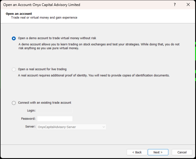 Download the attached .exe for windows or .pkg for Mac file. This is the MT5 terminal already linked to the Onyx Server.