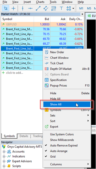 Market Watch Setup: If the Market Watch appears limited, right-click and select “Show All” to display all available markets.