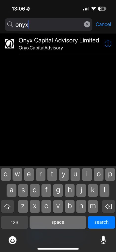 Search for Onyx Capital: In the search box, type “Onyx Capital” and press the search icon.